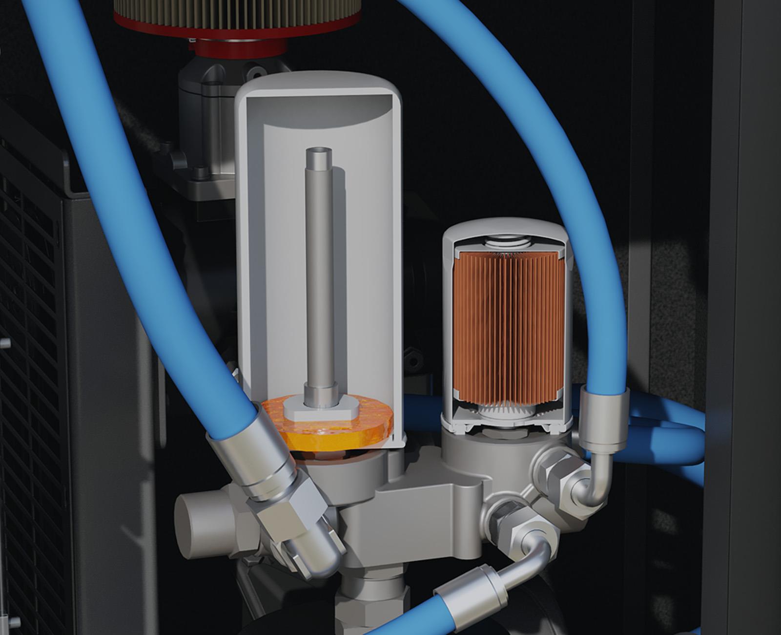 Effective separator elements keep the amount of oil in the outlet air low (1-3 mg/m³) for highquality compressed air